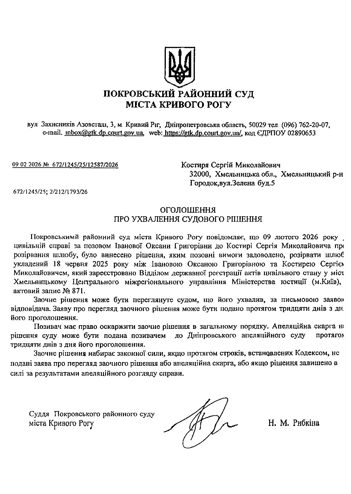 Повідомлення про розгляд цивільної справи за позовом Іванової Оксани Григорівни до Костирі Сергія Миколайовича про розірвання шлюбу