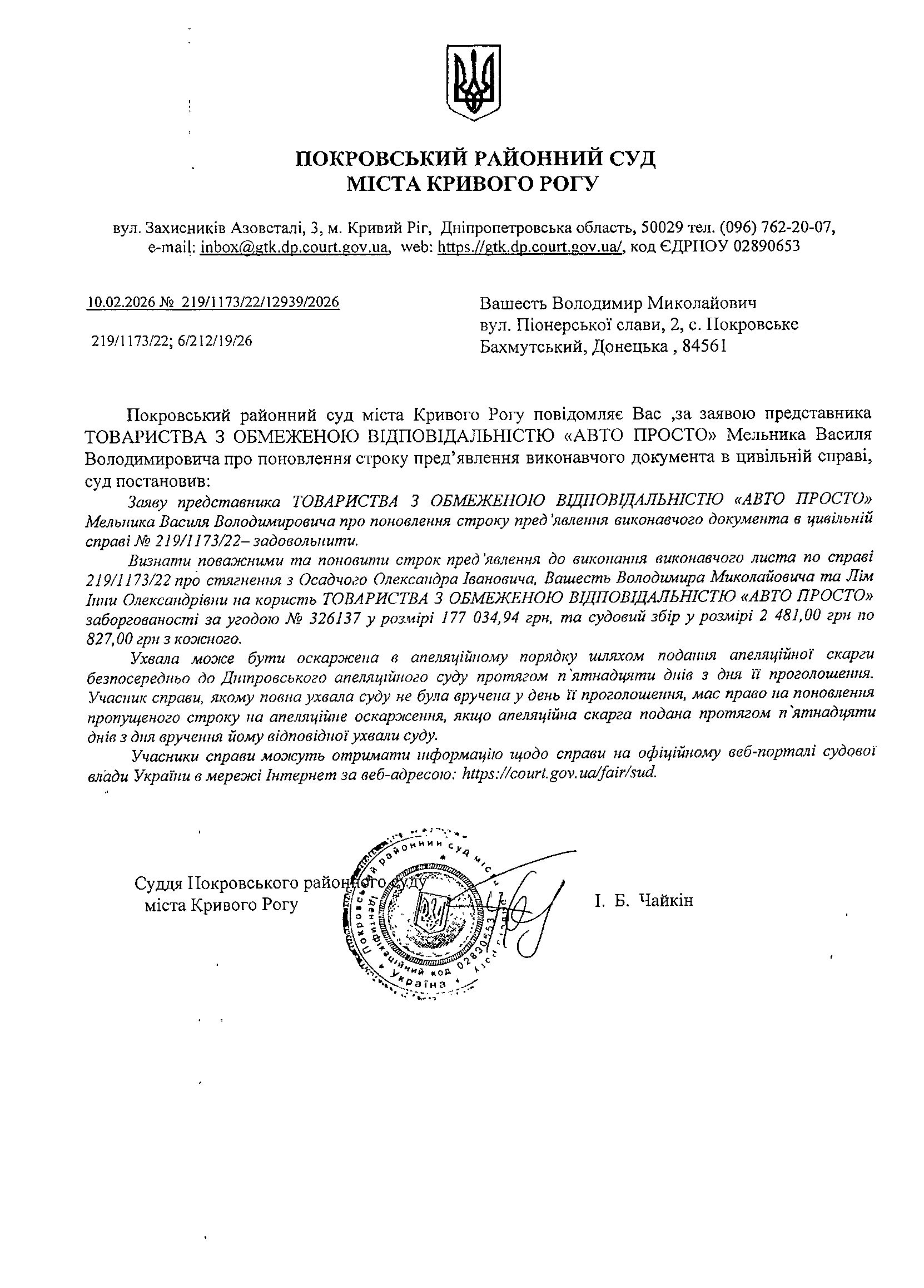 Повідомлення про розгляд цивільної справи за позовом ТОВ з обмеженою відповідальністю "АвтоПросто"" до Вашесть Володимира Миколайовича