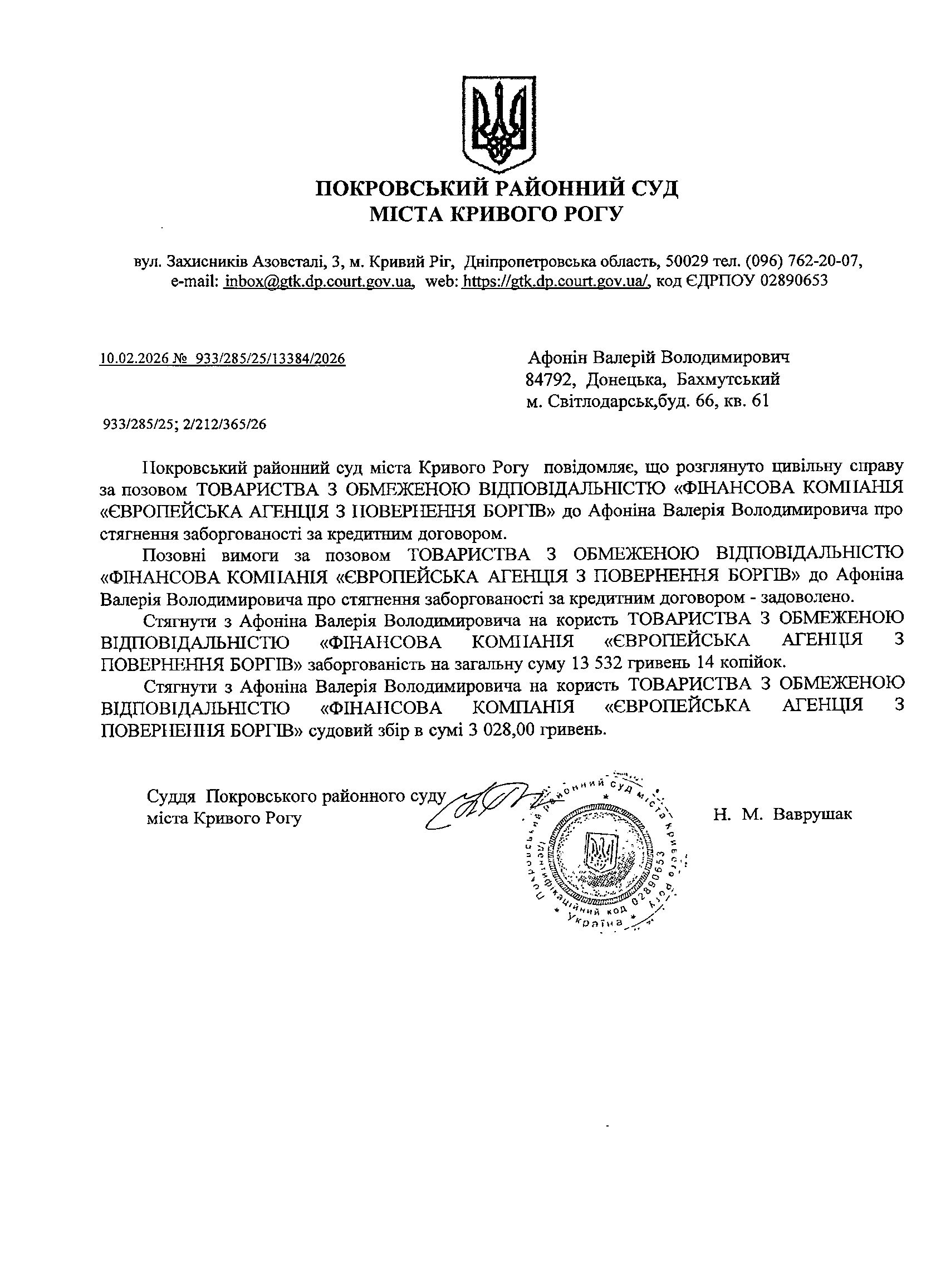 Повідомлення про розгляд цивільної справи за позовом ТОВ з обмеженою відповідальністю "Фінансова компанія "Європейська агенція з повернення боргів"" до Афоніна Валерія Володимировича про стягнення заборгованості за кредитним договором