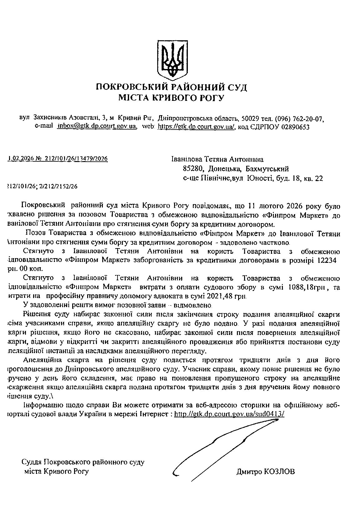 Повідомлення про розгляд цивільної справи за позовом ТОВ з обмеженою відповідальністю "ФІНПРОМ МАРКЕТ" до Іванілової Тетяни Антонівни про стягнення заборгованості за кредитним договором