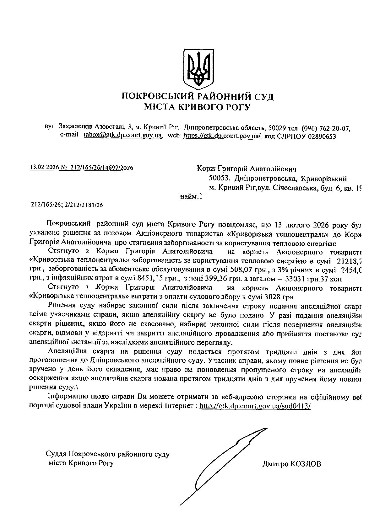 Повідомлення про розгляд цивільної справи за 'позовом Акціонерного товариства "Криворізька теплоцентраль" до Корж Григорія Анатолійовича про стягнення заборгованості за послугу з постачання теплової енергії