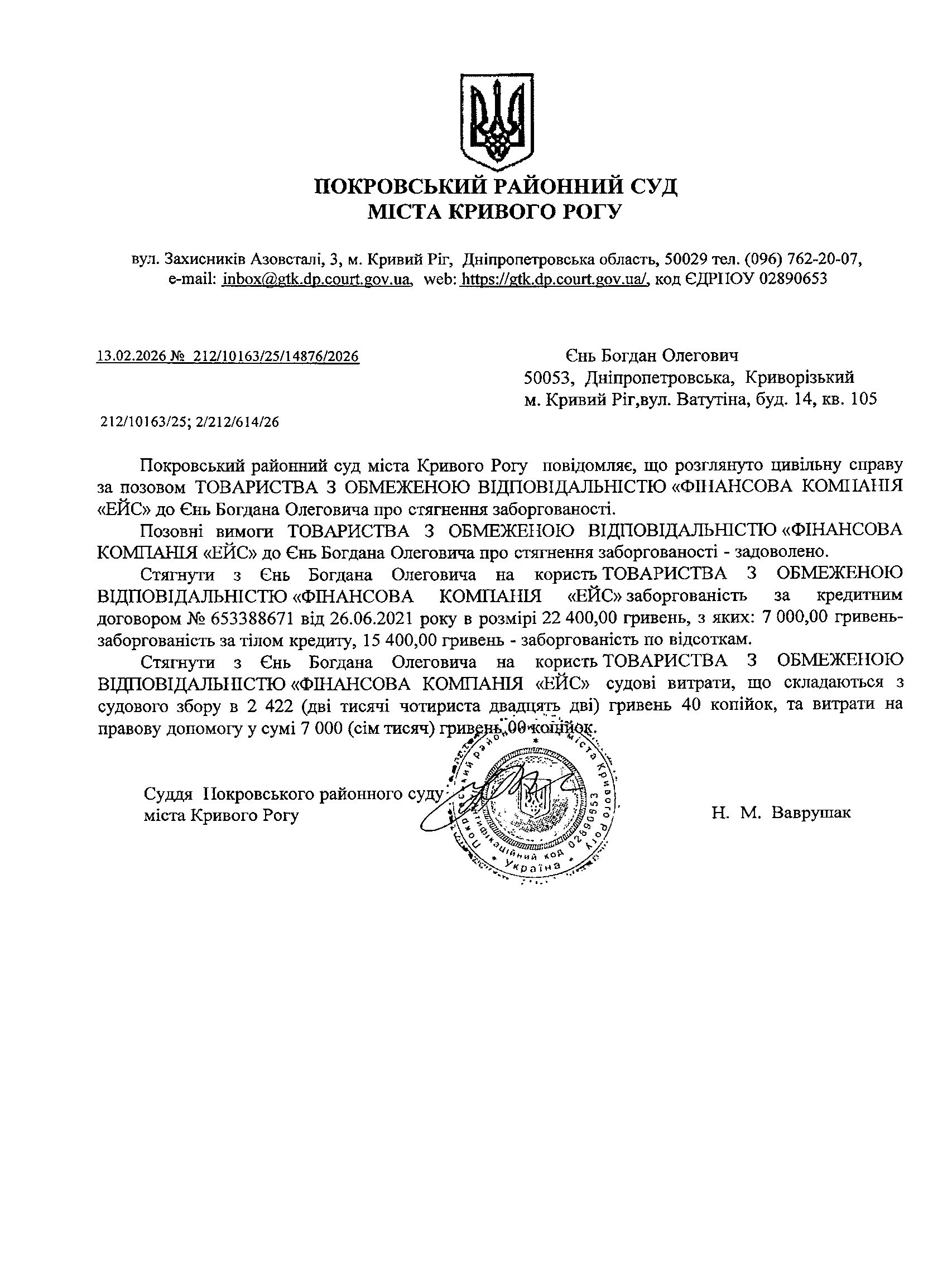 Повідомлення про розгляд цивільної справи за позовом ТОВ з обмеженою відповідальністю "Фінансова компанія "ЕЙС" до Єнь Богдана Олеговича про стягнення заборгованості за кредитним договором