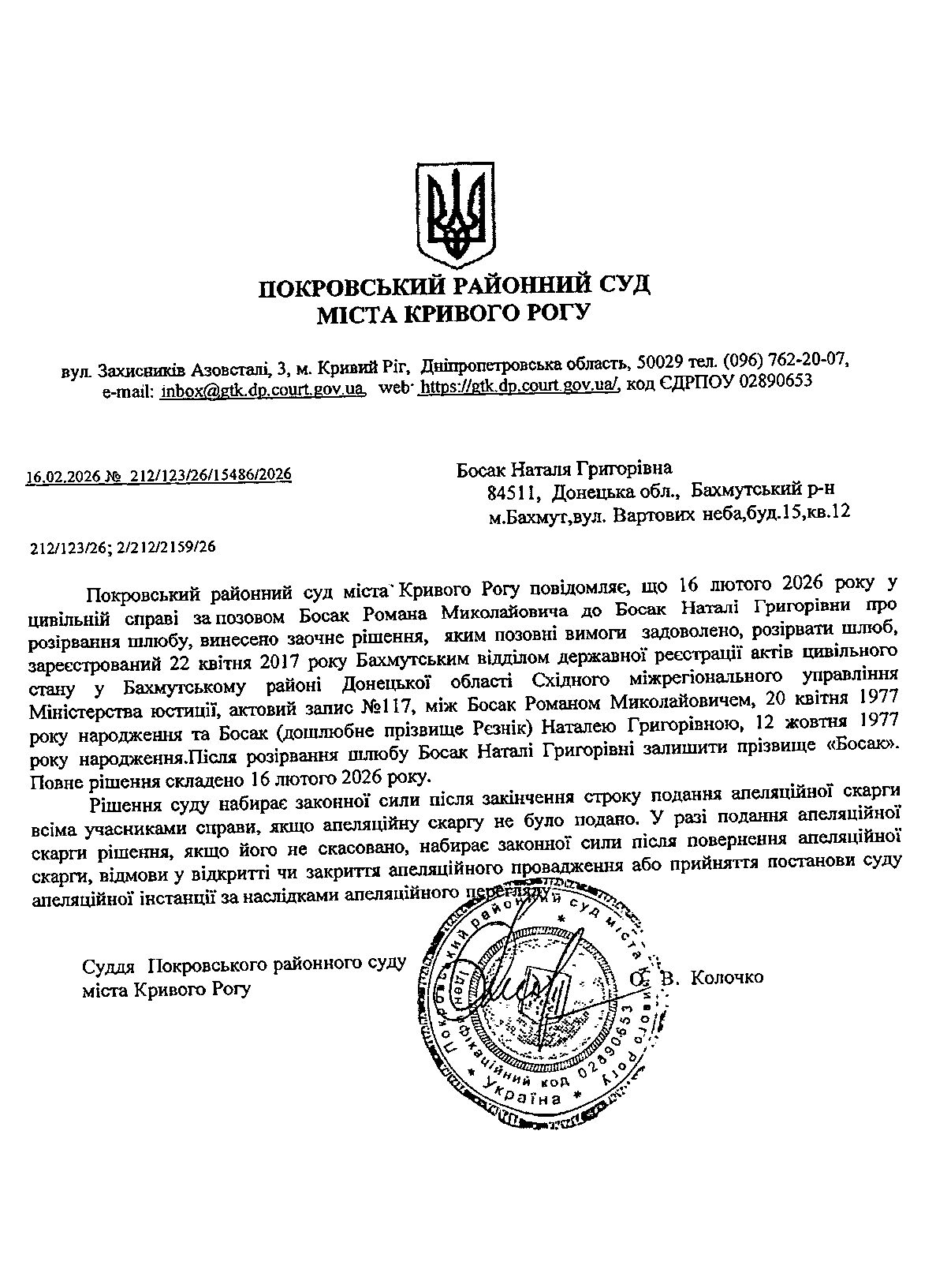 Повідомлення про розгляд цивільної справи за позовом Босак Романа Миколайовича до Босак Наталі Григорівни про розірвання шлюбу