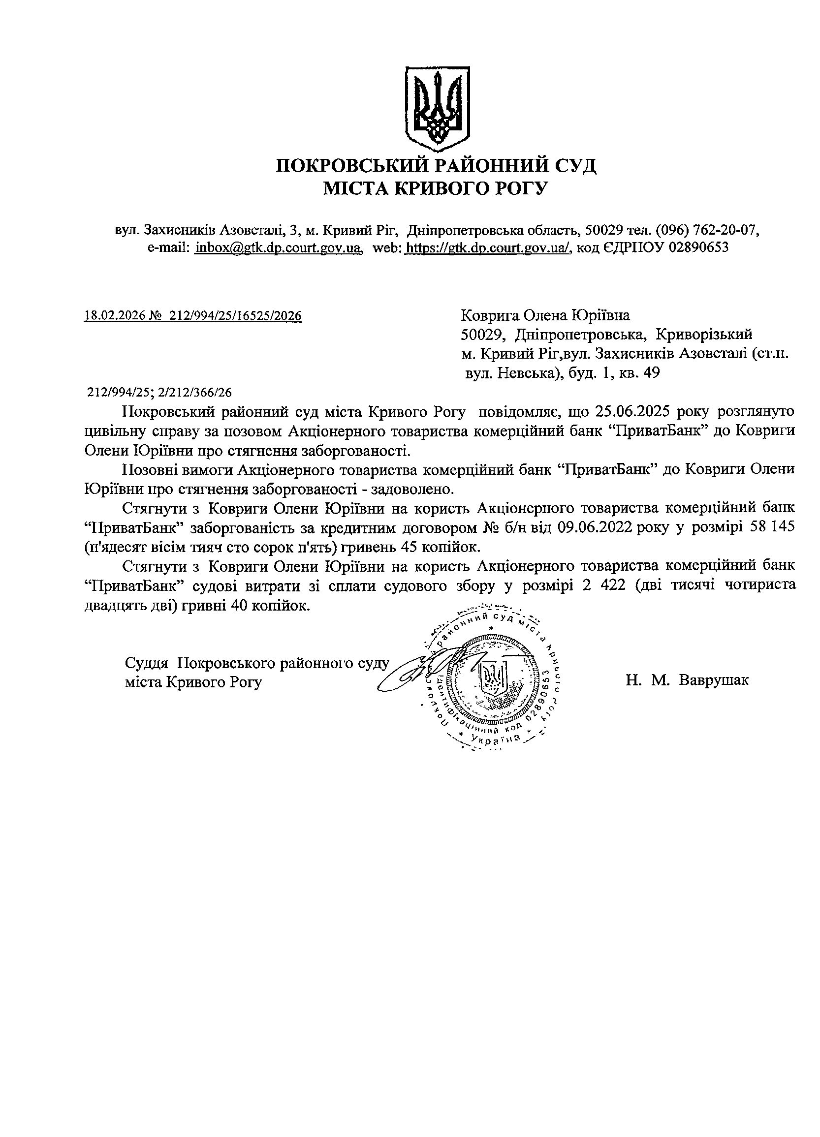 Повідомлення про розгляд цивільної справи за позовом АТ КБ "ПриватБанк" до Ковриги Олени Юріївни про стягнення заборгованості