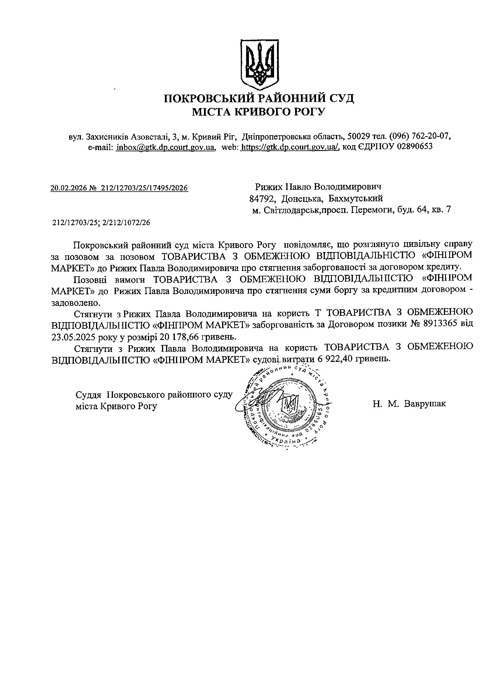 Повідомлення про розгляд цивільної справи за позовом ТОВ з обмеженою відповідальністю "ФІНПРОМ МАРКЕТ" до Рижих Павла Володимировича про стягнення заборгованості за кредитним договором