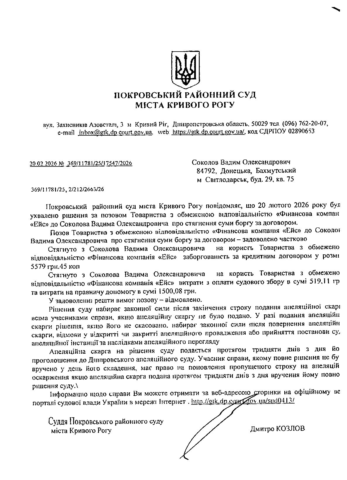 Повідомлення про розгляд цивільної справи за позовом ТОВ з обмеженою відповідальністю "Фінансова компанія "ЕЙС" до Соколова Вадима Олександровича про стягнення заборгованості за кредитним договором