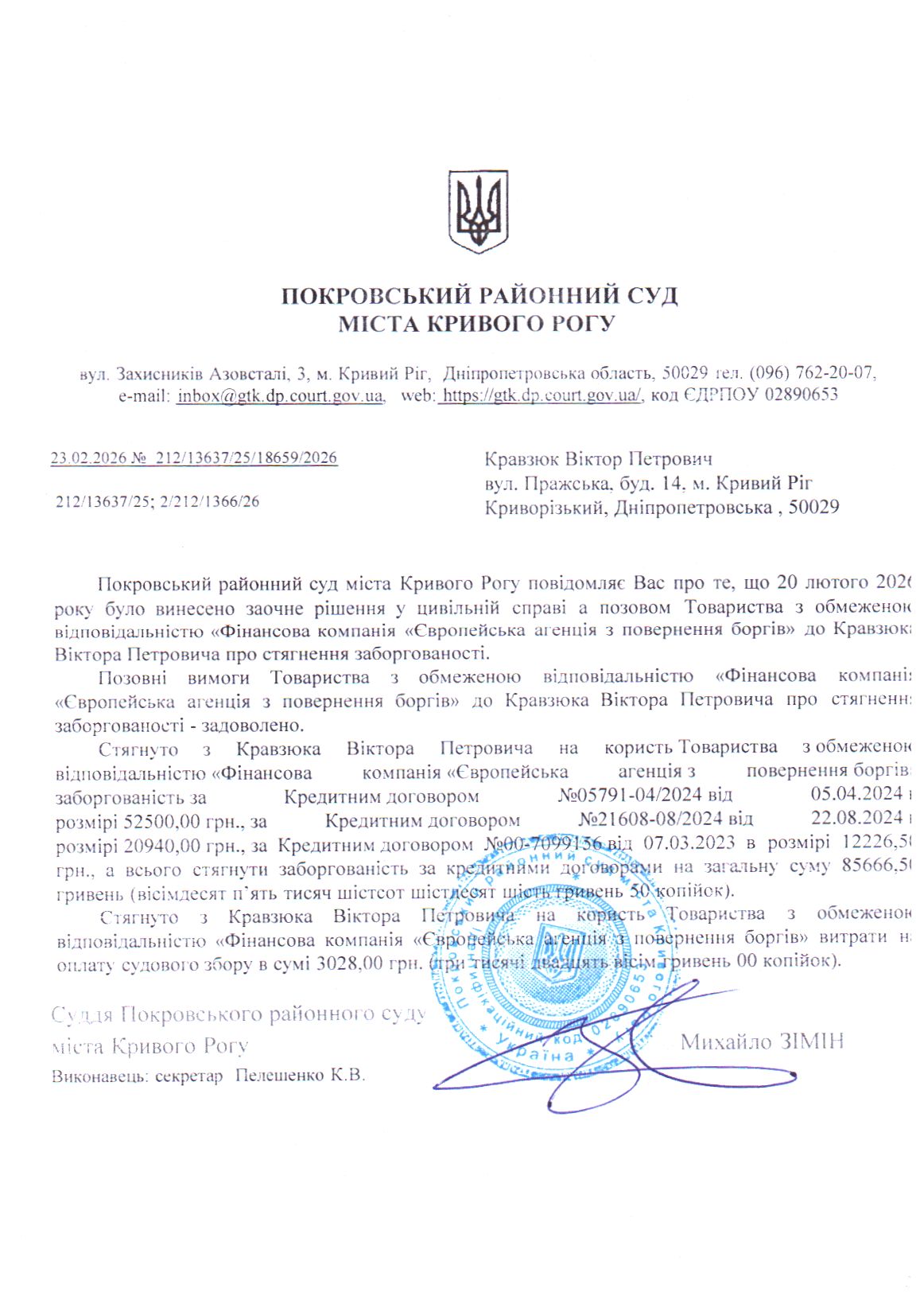 Повідомлення про розгляд цивільної справи за позовом ТОВ з обмеженою відповідальністю "Фінансова компанія "Європейська агенція з повернення боргів"" до Кравзюка Віктора Петровича про стягнення заборгованості за кредитним договором