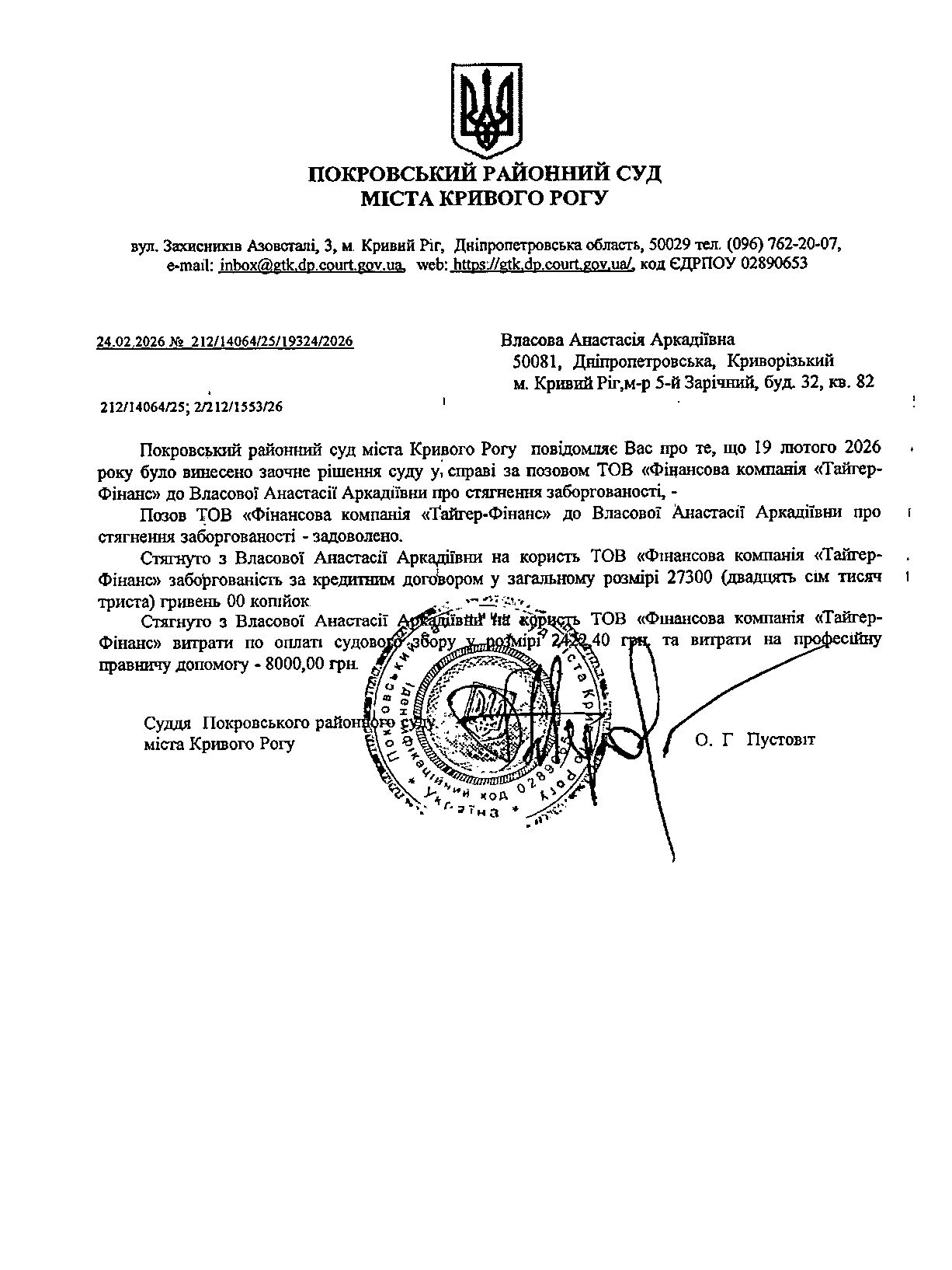 Повідомлення про розгляд цивільної справи за позовом ТОВ з обмеженою відповідальністю "Фінансова компанія "Тайгер - Фінанс" до Власової Анастасії Аркадіївни про стягнення заборгованості за кредитним договором