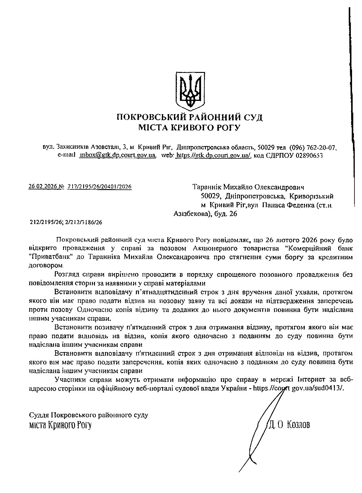 Повідомлення про розгляд цивільної справи за позовом АТ КБ "ПриватБанк" до Таранніка Михайла Олександровича про стягнення заборгованості