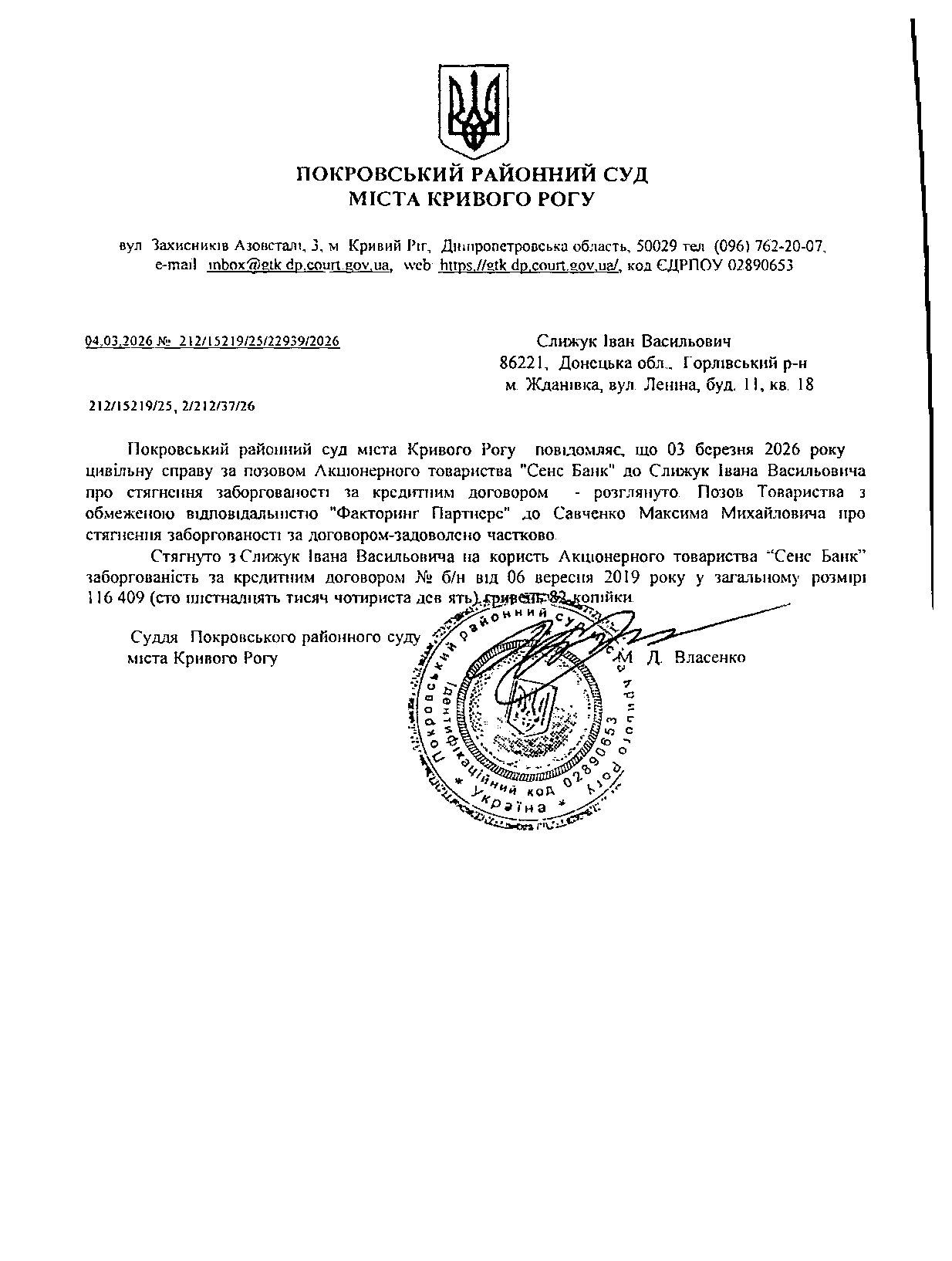 Повідомлення про розгляд цивільної справи за позовом АТ "СенсБанк" до Слижука Івана Васильовича про стягнення заборгованості