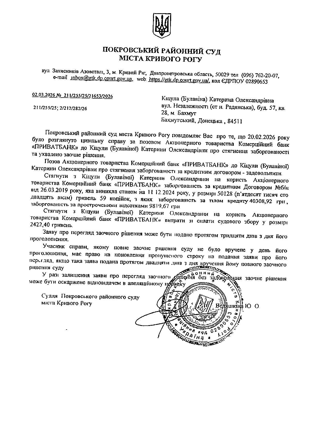 Повідомлення про розгляд цивільної справи за позовом АТ КБ "ПриватБанк" до Кіцули (Булавіної) Катерини Олександрівни про стягнення заборгованості