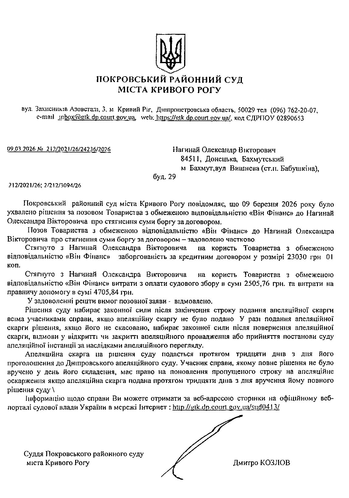 Повідомлення про розгляд цивільної справи за позовом ТОВ з обмеженою відповідальністю "Він Фінанс" до Нагинай Олександра Вікторовича про стягнення заборгованості за кредитним договором