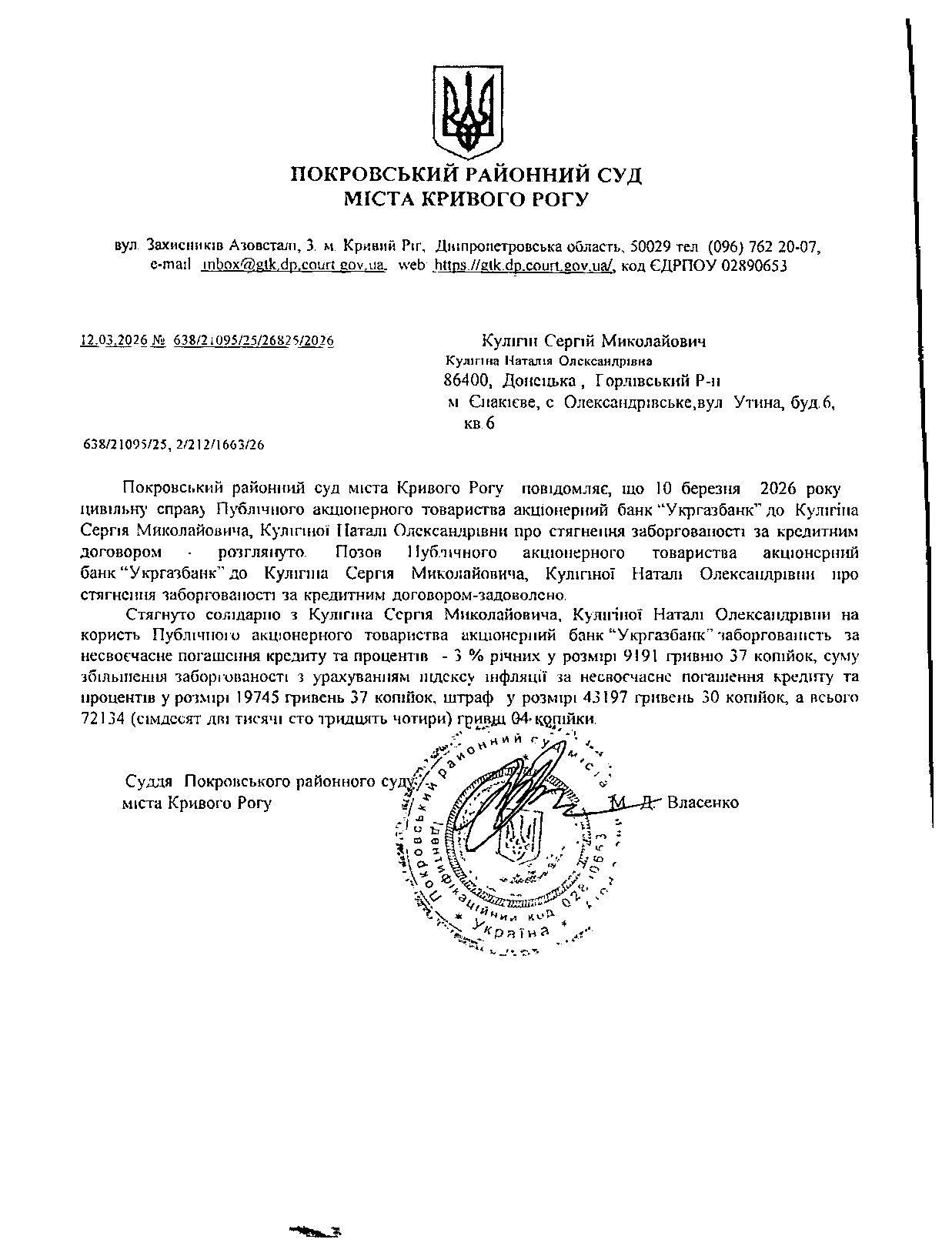 Повідомлення про розгляд цивільної справи за позовом ПАТ "Укргазбанк" до Кулигіна Сергія Миколайовича про стягнення заборгованості