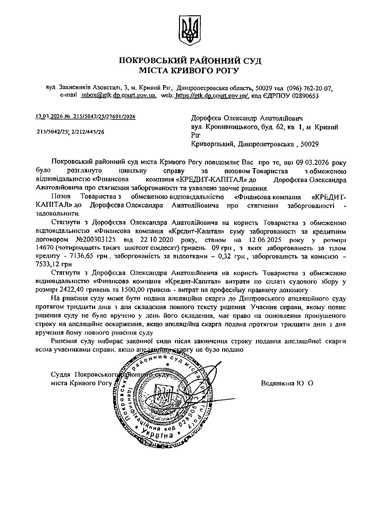 Повідомлення про розгляд цивільної справи за позовом ТОВ з обмеженою відповідальністю "Фінансова компанія "Кредит - Капітал"" до Дорофєєва Олександра Анатолійовича про стягнення заборгованості за кредитним договором