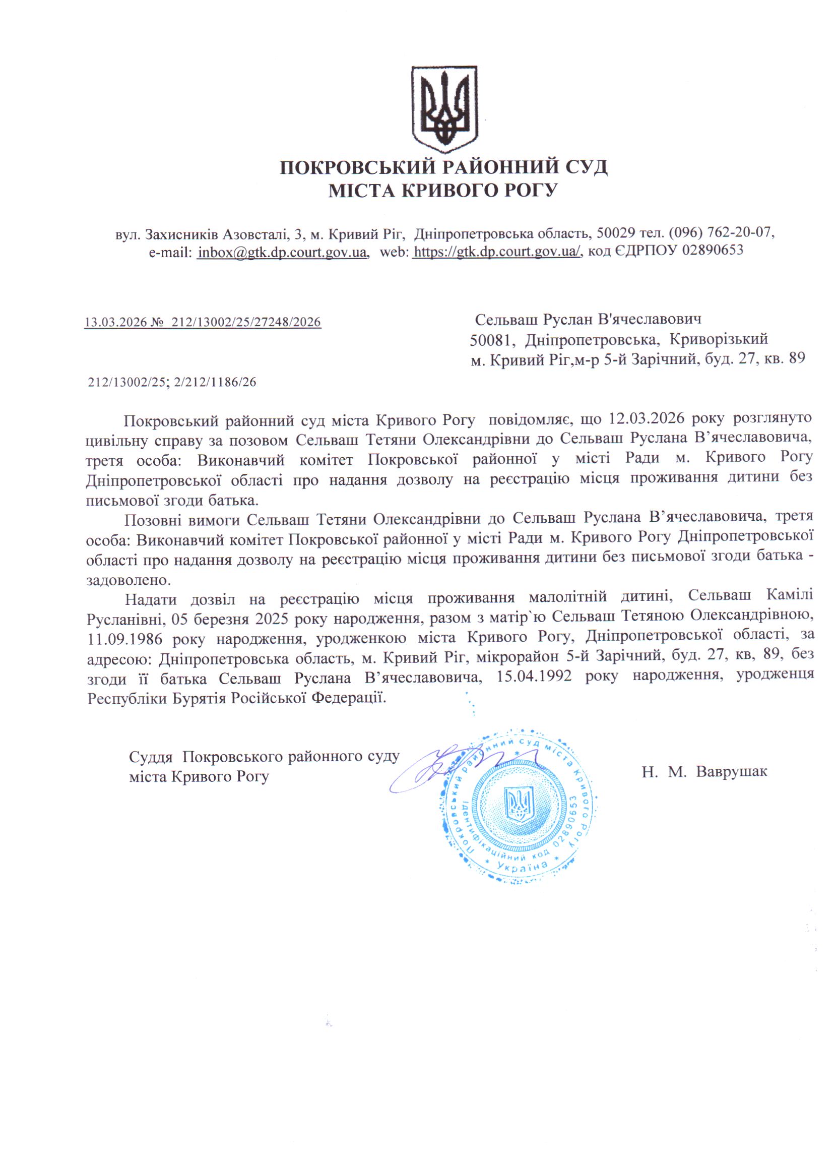 Повідомлення про розгляд цивільної справи за позовом Сельваш Тетяни Олександрівни до Сельваш Руслана В'ячеславовича про надання дозволу на реєстрацію місця проживання дитини