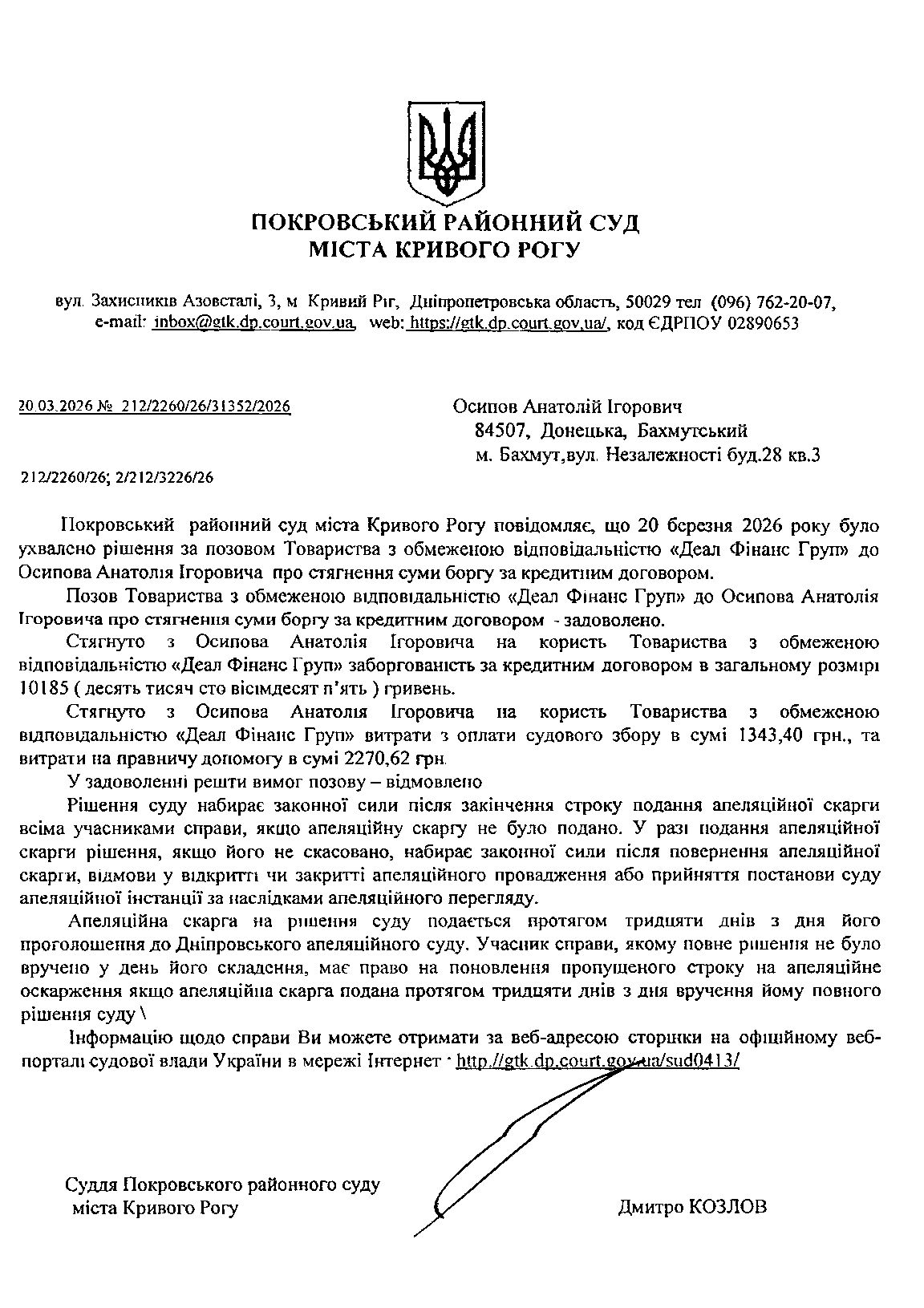 Повідомлення про розгляд цивільної справи за позовом ТОВ з обмеженою відповідальністю "Деал Фінанс Груп" до Осипова Анатолія Ігоровича про стягнення заборгованості за кредитним договором