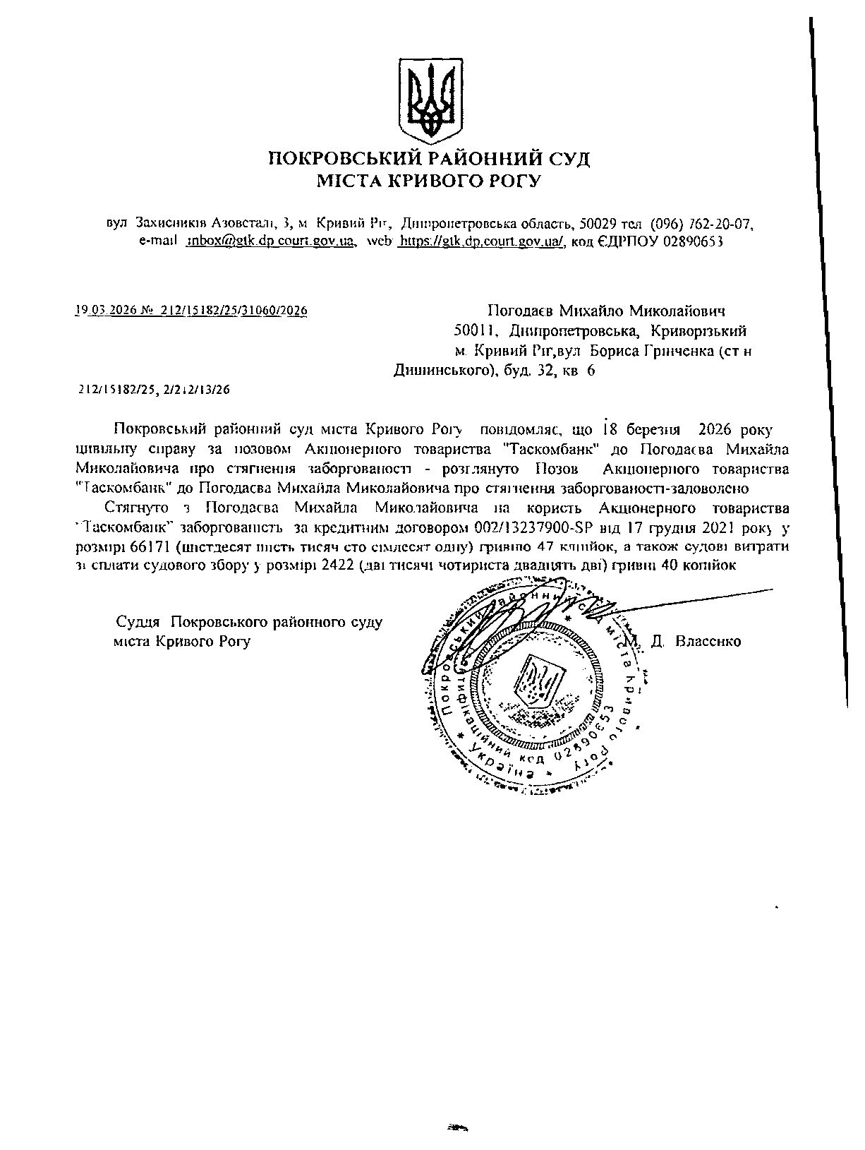 Повідомлення про розгляд цивільної справи за позовом АТ "ТаскомБанк" до Погодаєва Михайла Миколайовича про стягнення заборгованості