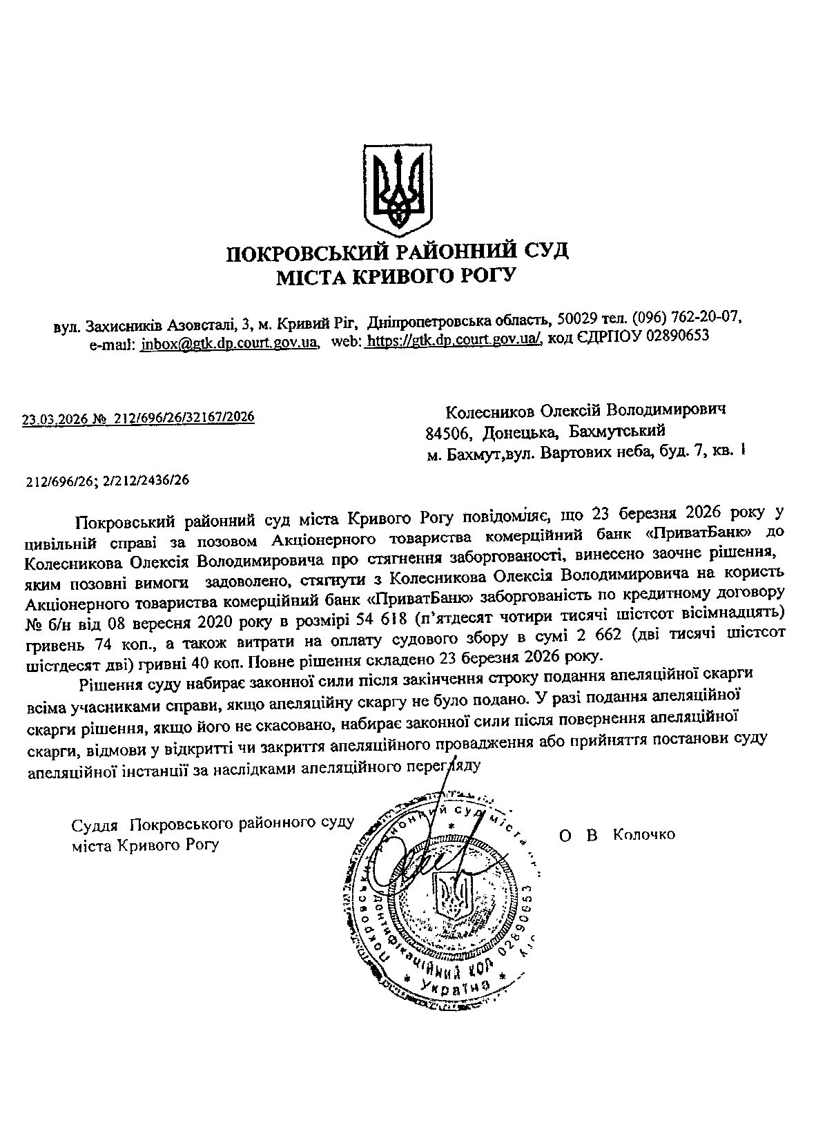 Повідомлення про розгляд цивільної справи за позовом АТ КБ "ПриватБанк" до Колесникова Олексія Володимировича про стягнення заборгованості