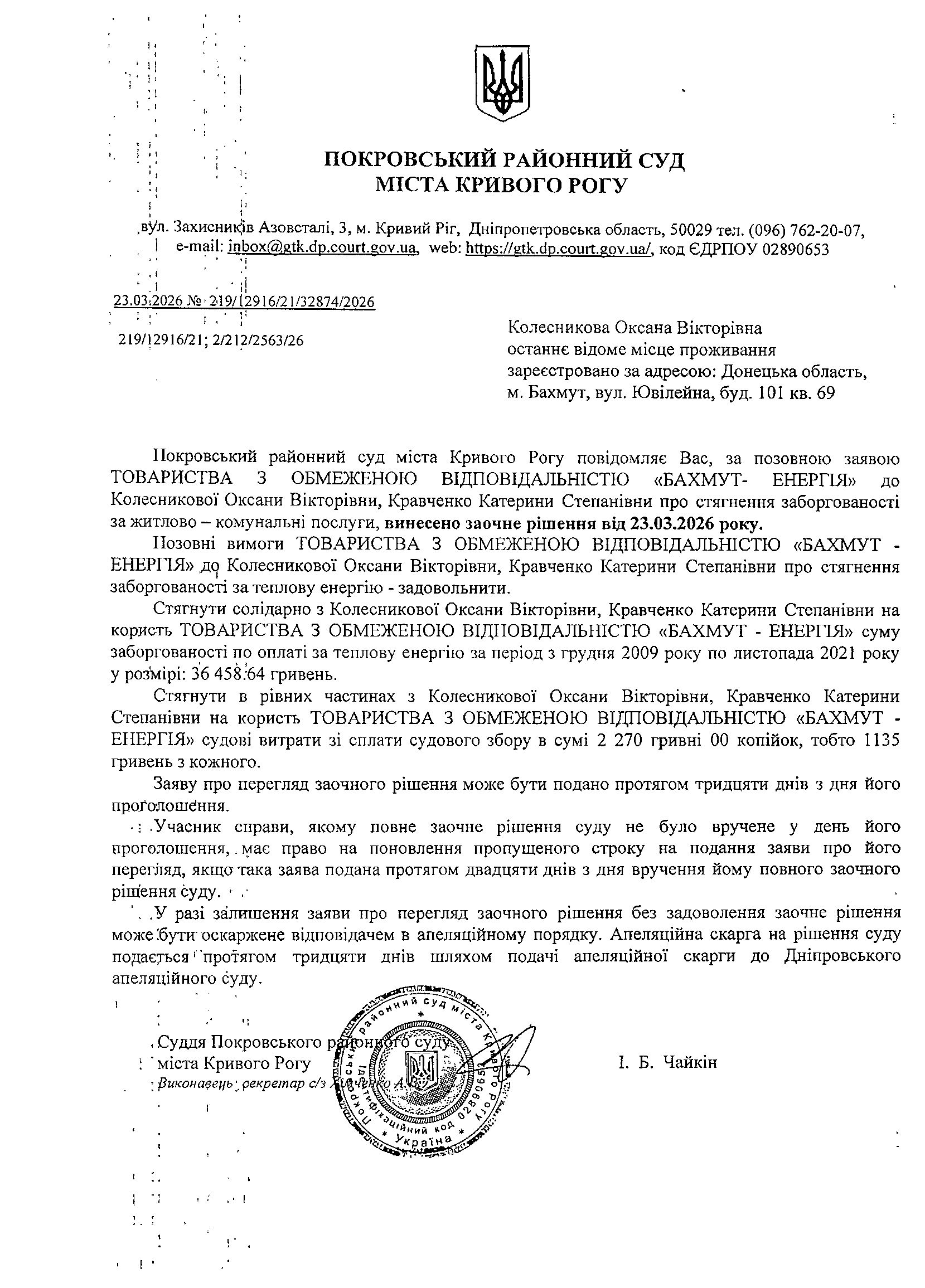 Повідомлення про розгляд цивільної справи за позовом ТОВ з обмеженою відповідальністю "Бахмут-Енергія" до Колесникової Оксани Вікторівни про стягнення заборгованості