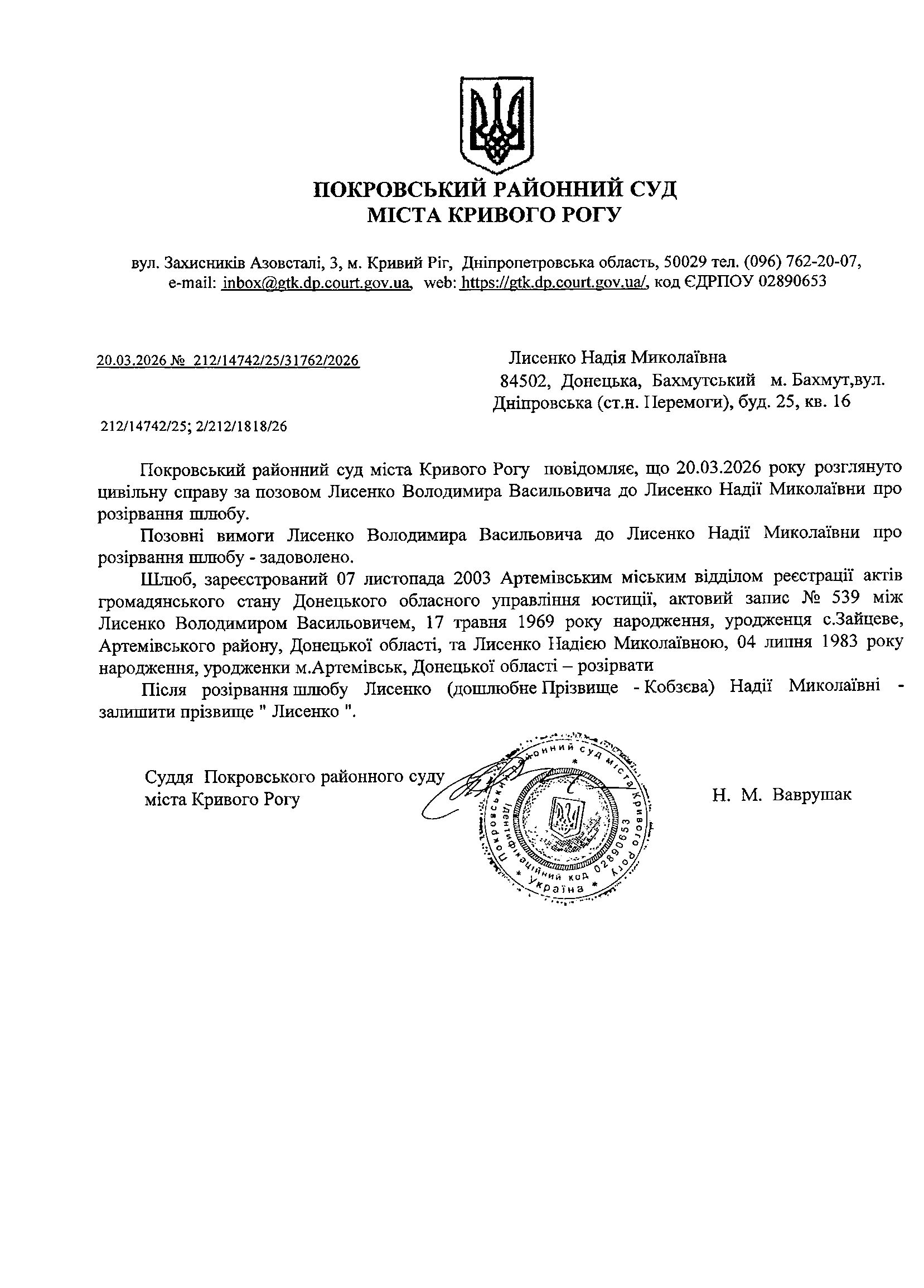 Повідомлення про розгляд цивільної справи за позовом Лисенко Володимира Васильовича до Лисенко Надії Миколаївни про розірвання шлюбу