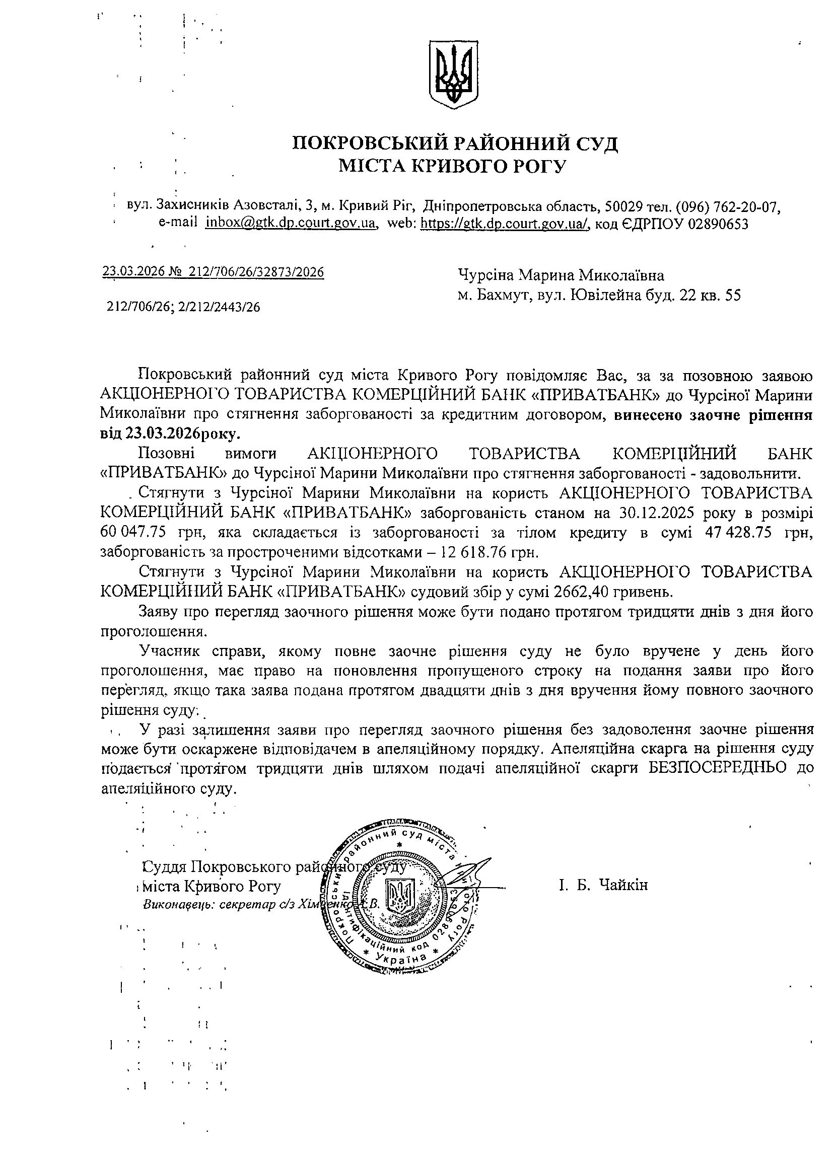 Повідомлення про розгляд цивільної справи за позовом АТ КБ "ПриватБанк" до Чурсіної Марини Миколаївни про стягнення заборгованості