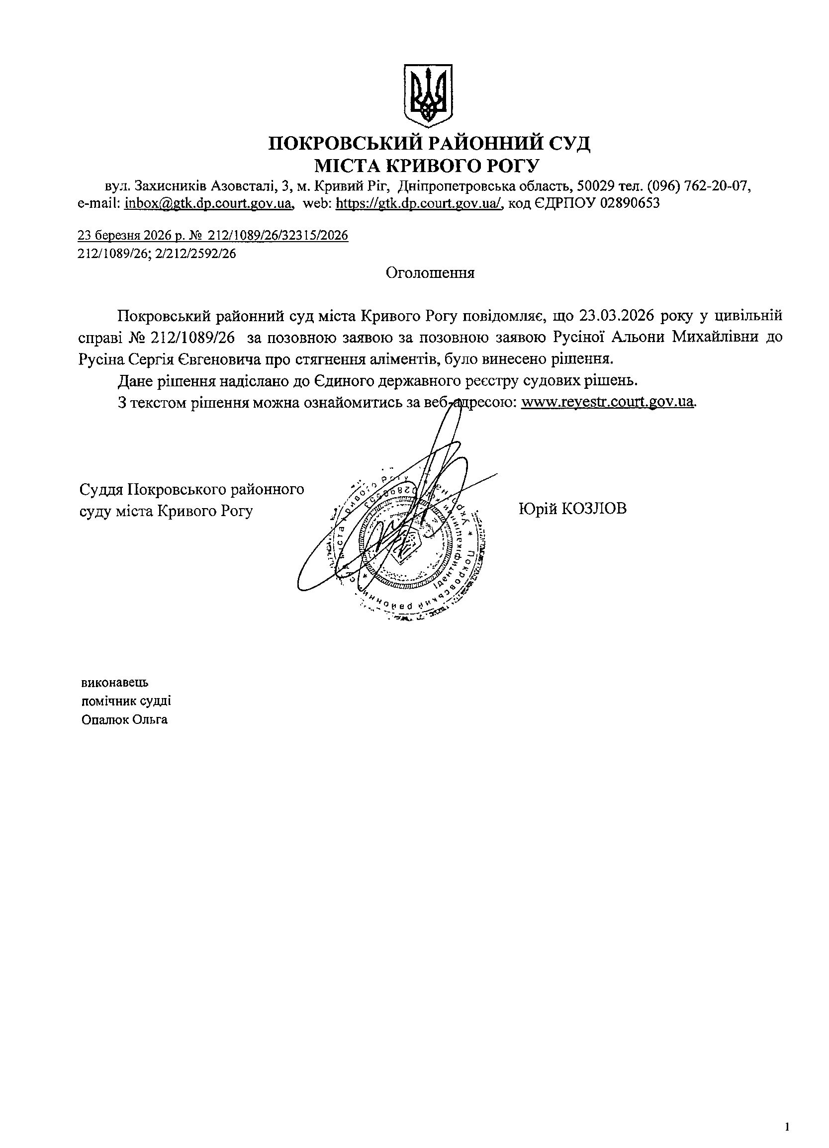 Повідомлення про розгляд цивільної справи за позовом Русіної Альони Михайлівни до Русіна Сергія Євгеновича про стягнення аліментів