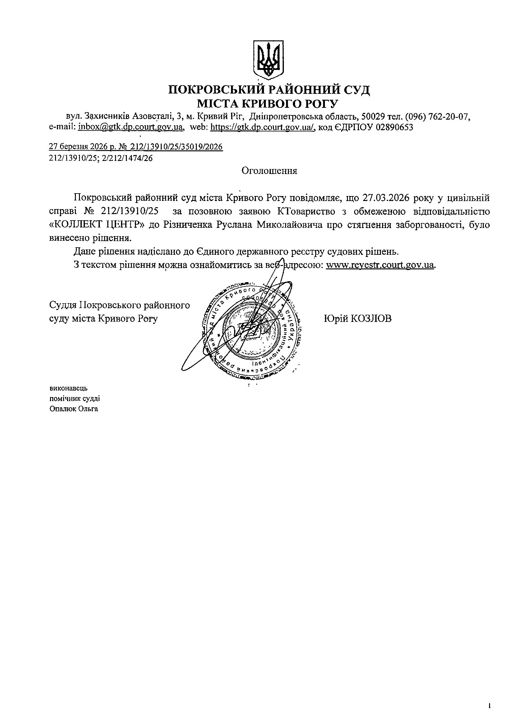 Повідомлення про розгляд цивільної справи за позовом ТОВ з обмеженою відповідальністю "Коллект Центр" до Різниченка Руслана Миколайовича про стягнення заборгованості за кредитним договоромОголошення про виклик до суду Балагуна Леоніда Дмитровича