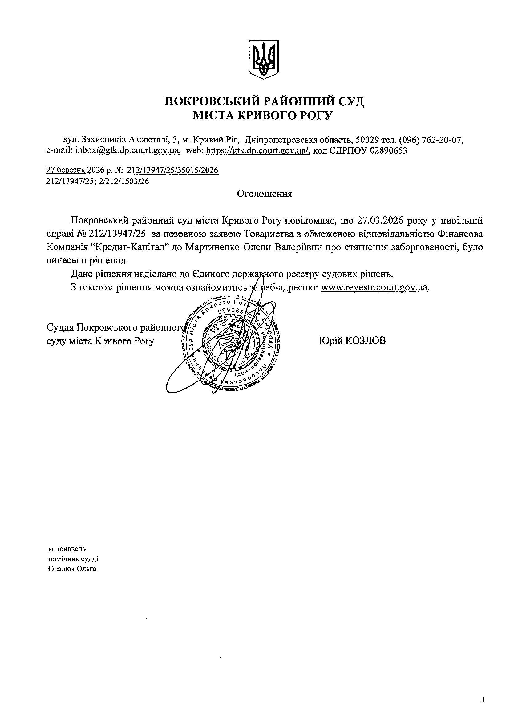 Повідомлення про розгляд цивільної справи за позовом ТОВ з обмеженою відповідальністю Фінансова Компанія "Кредит-Капітал" до Мартиненко Олени Валеріївни про стягнення заборгованості за кредитним договоромОголошення про виклик до суду Балагуна Леоніда Дмит