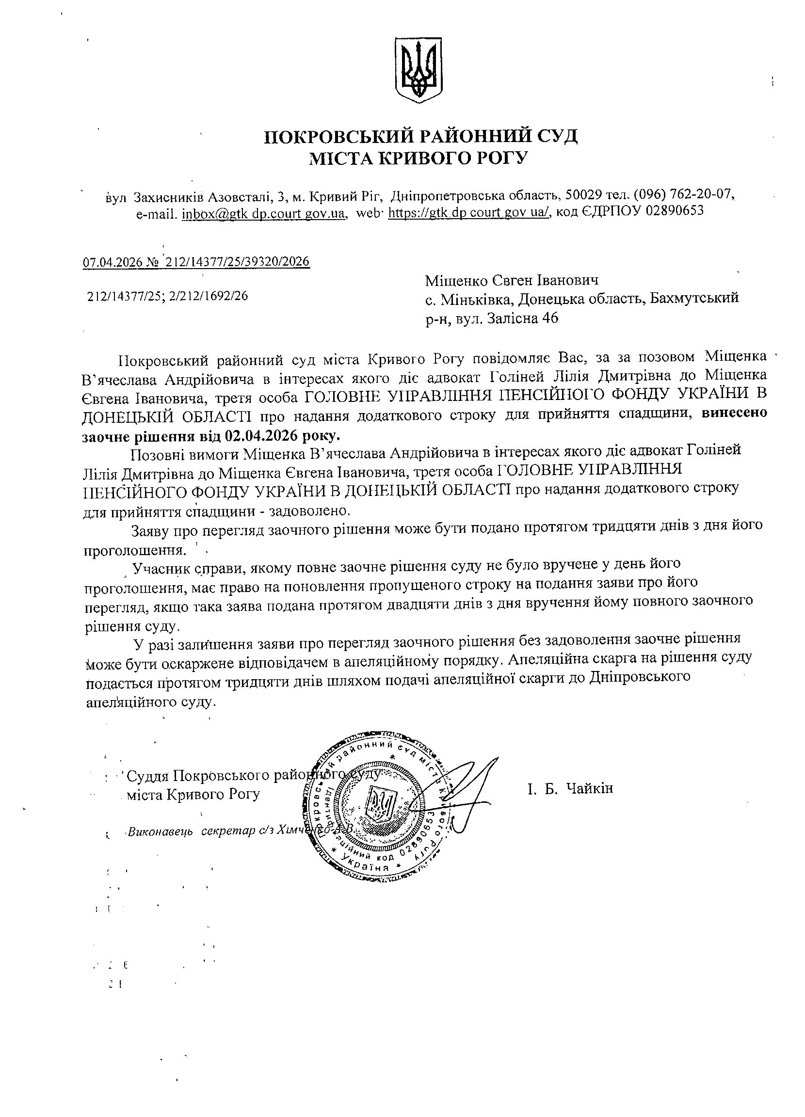 Повідомлення про розгляд цивільної справи за позовом Міщенка В'ячеслава Андрійовича до Міщенка Євгена Івановича про надання додаткового строку для прийняття спадщини