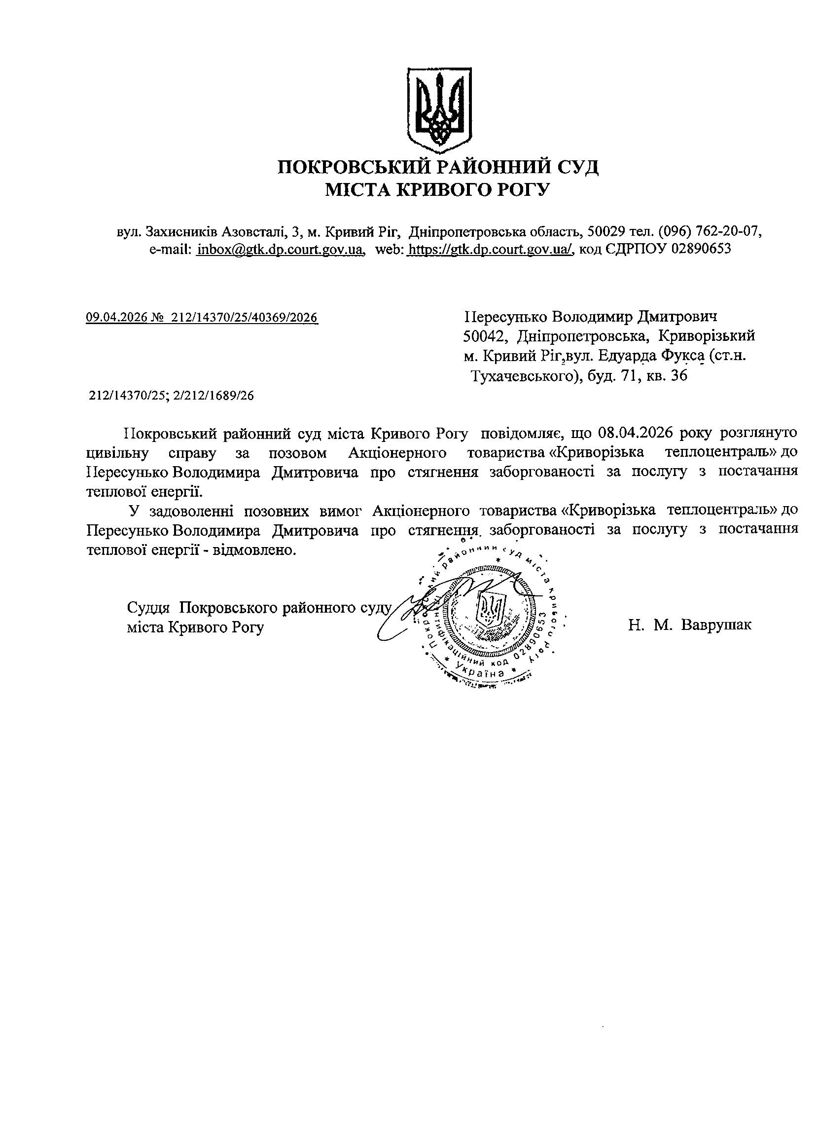 Повідомлення про розгляд цивільної справи за 'позовом Акціонерного товариства "Криворізька теплоцентраль" до Пересунько Володимира Дмитровича про стягнення заборгованості за послугу з постачання теплової енергії