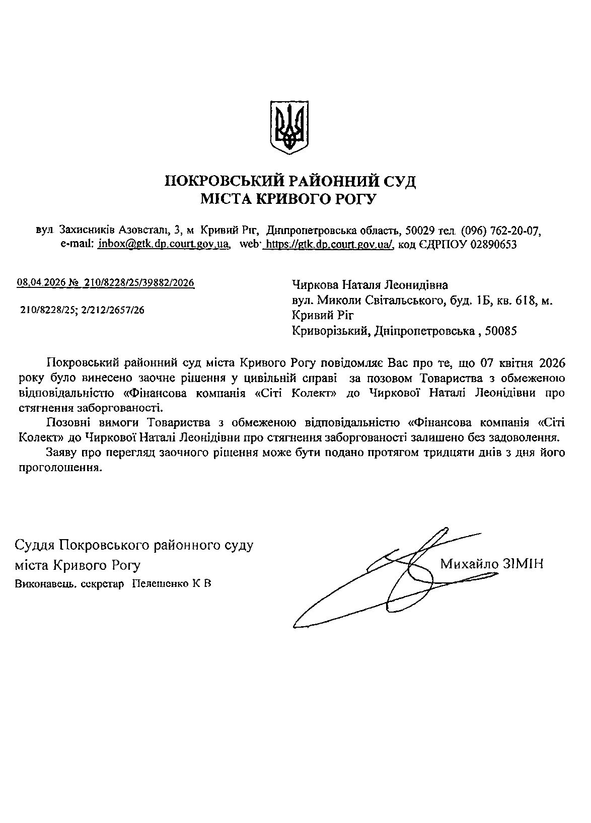 Повідомлення про розгляд цивільної справи за позовом ТОВ з обмеженою відповідальністю "Фінансова компанія ""Сіті Колект до Чиркової Наталі Леонідівни про стягнення заборгованості за кредитним договором