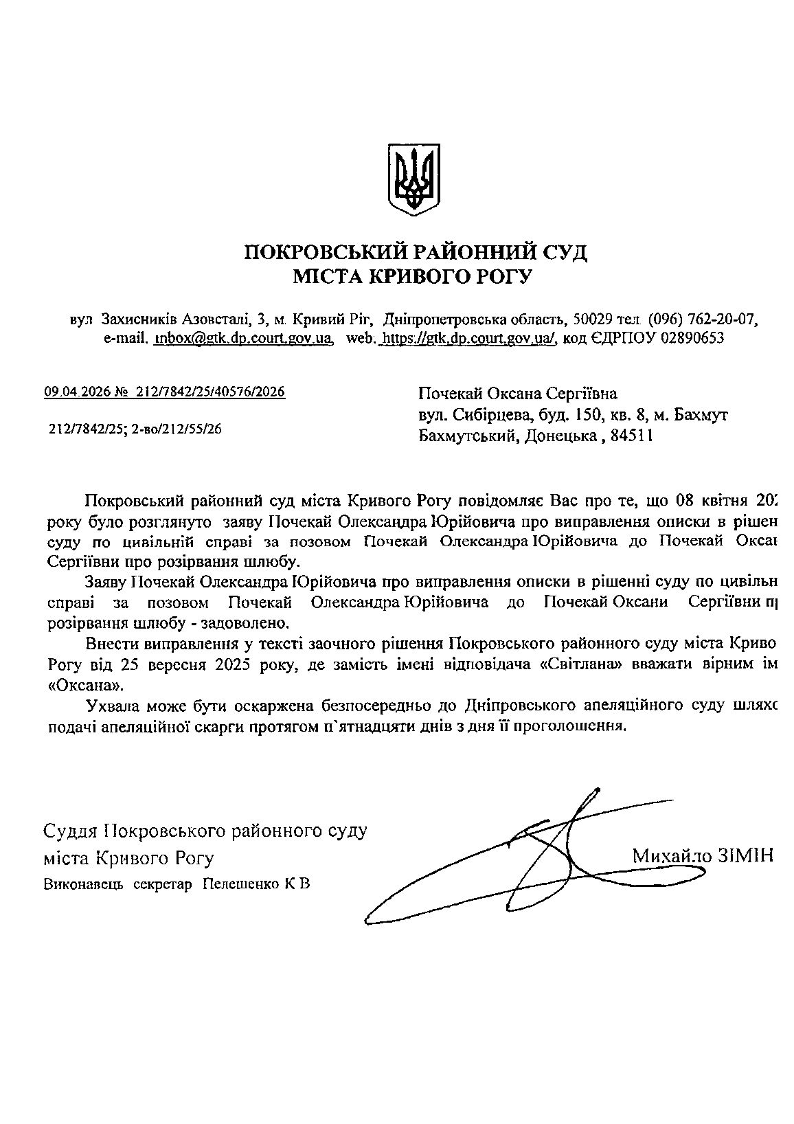 Повідомлення про розгляд заяви про виправлення описки за позовом Почекай Олександра Юрійовича до Почекай Оксани Сергіївни про розірвання шлюбу