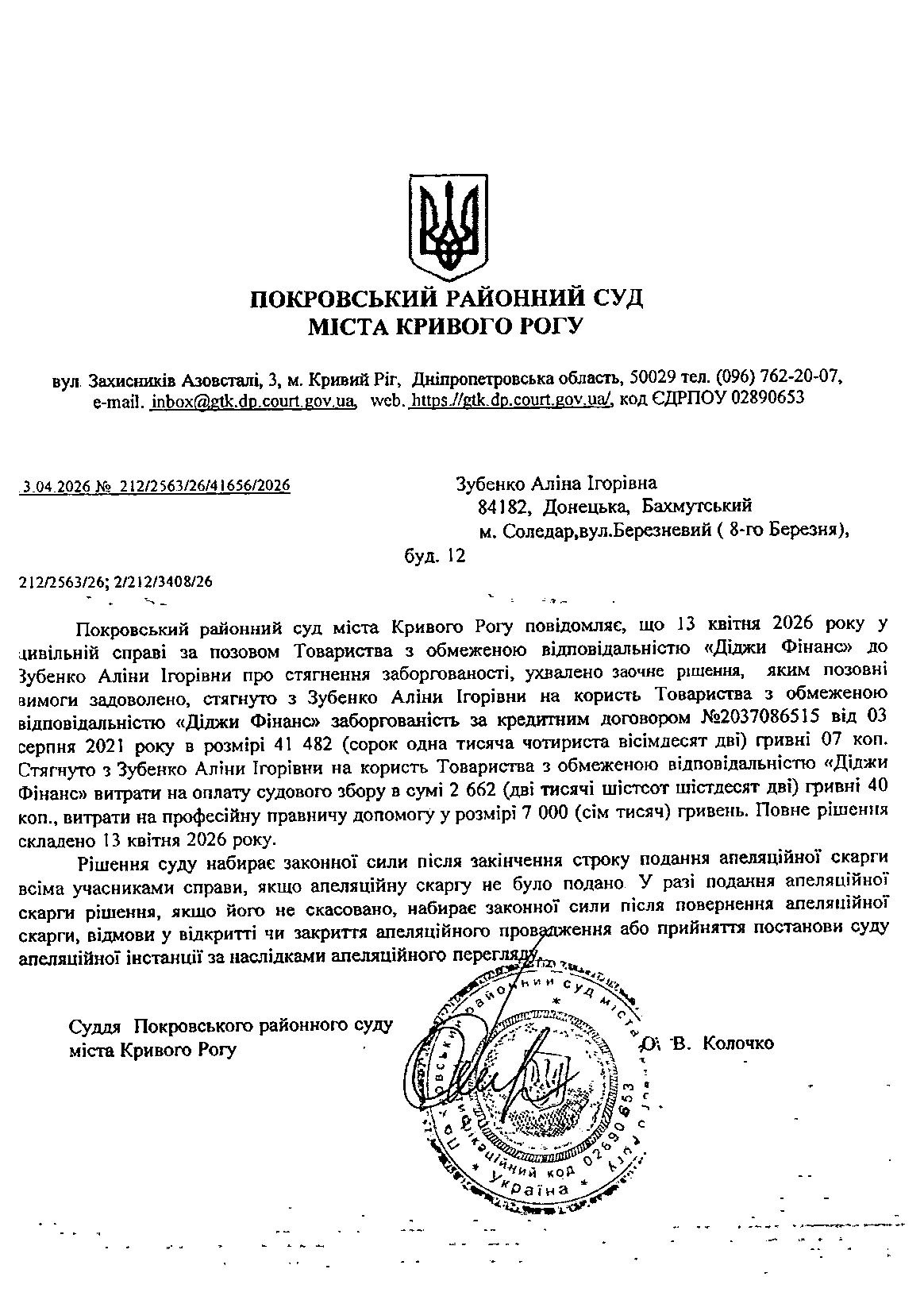 Повідомлення про розгляд цивільної справи за позовом ТОВ з обмеженою відповідальністю "Діджи Фінанс" до Зубенко Аліни Ігорівни про стягнення заборгованості за кредитним договором