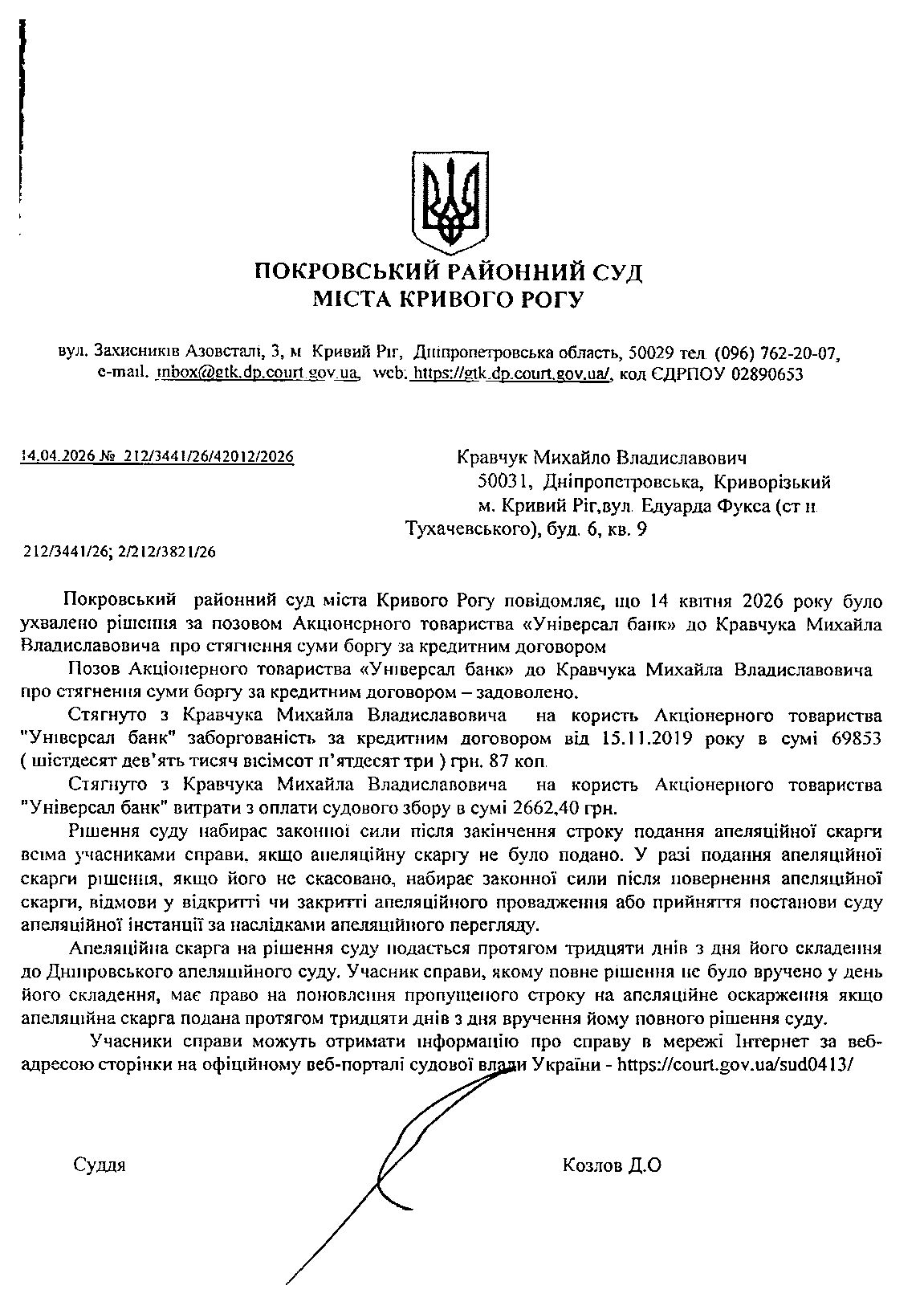 Повідомлення про розгляд цивільної справи за позовом АТ "Універсал Банк" до Кравчука Михайла Владиславовича про стягнення заборгованості