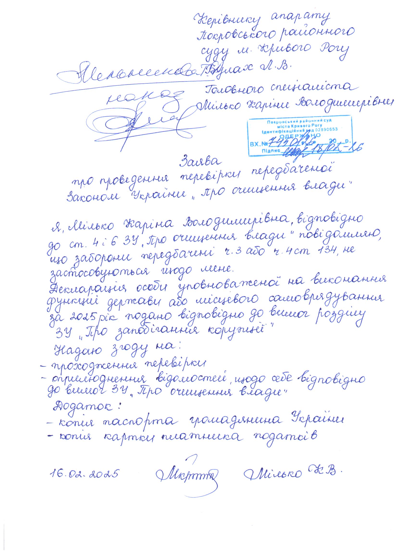 Заява Мілько Каріни Володимирівни про проведення перевірки, передбаченої ЗУ "Про очищення влади"