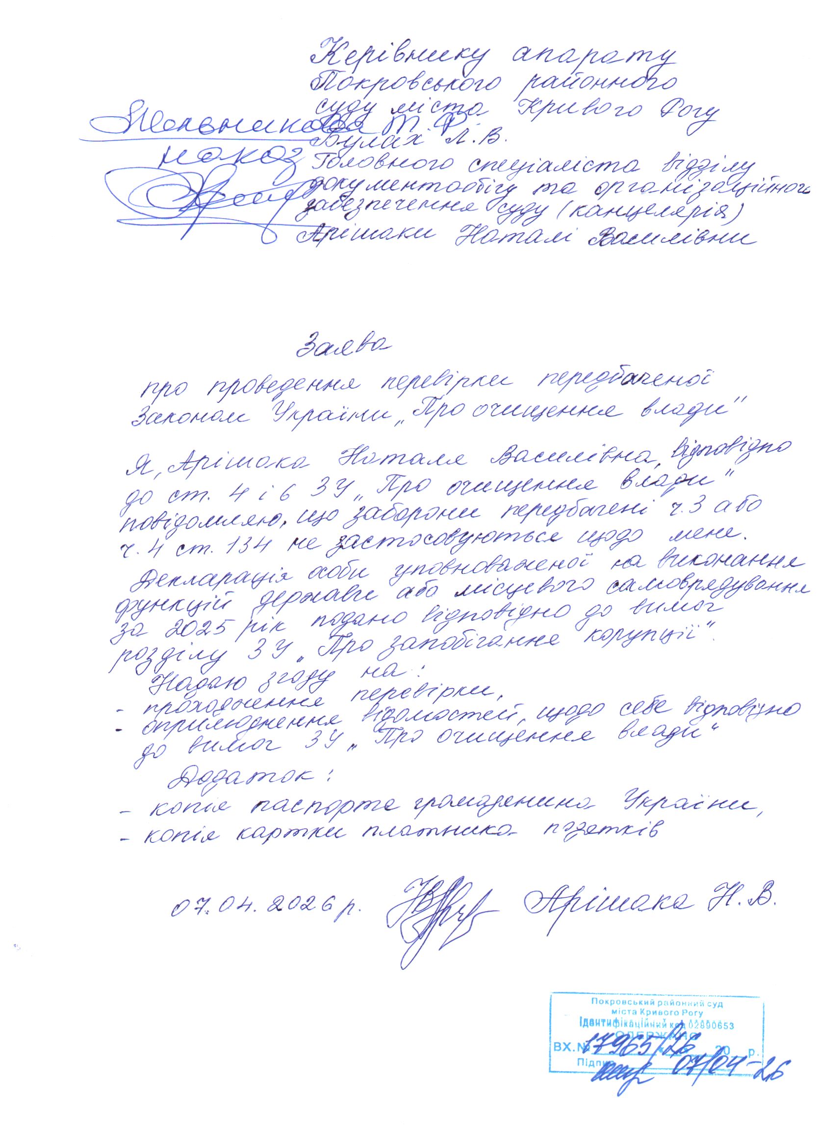 Заява Арішаки Наталі Василівни про проведення перевірки, передбаченої ЗУ "Про очищення влади"